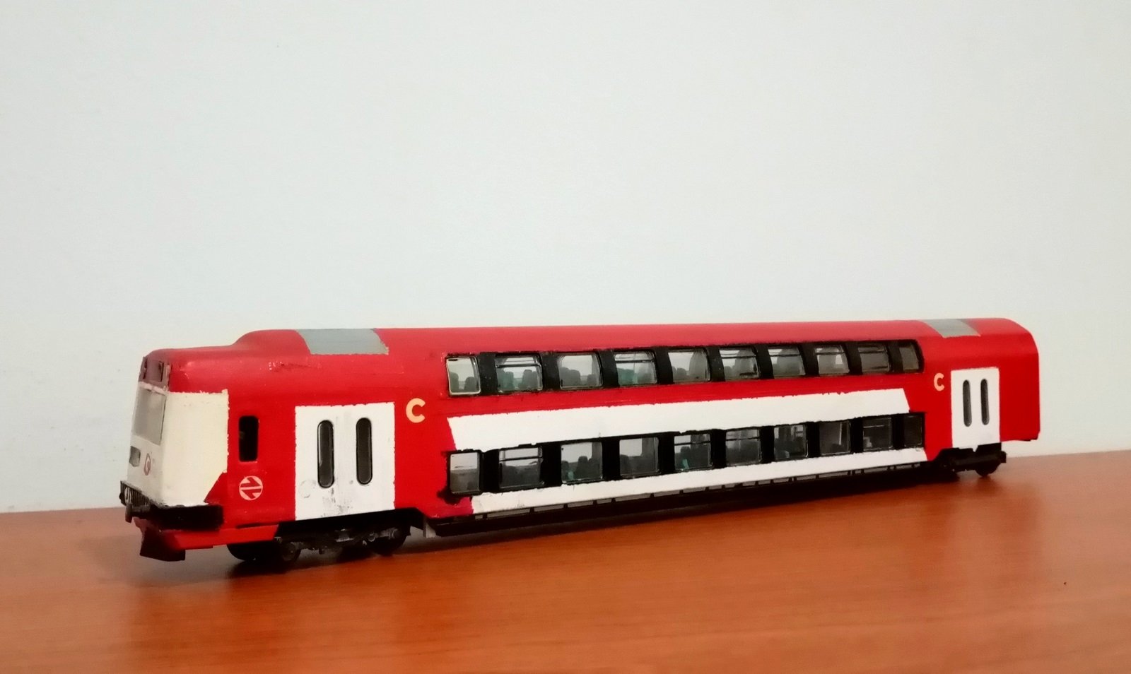 Per fer aquesta reproducció a escala 1:87 exacta, s´han emprat cotxes de rodalies alemanys de doble pis, de la marca Trix, s´han retallat, s´han enganxat fins la mida exacta, i al cotxe cabina, se li ha posat un nou frontal. Tot seguit, s´ha repintat.