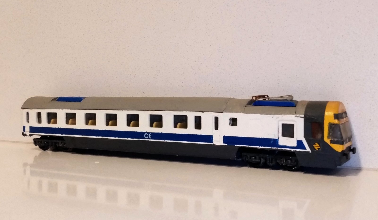El model que mostro aquí, és a escala H0, i forma part de la meva col.lecció particular, manté encara els colors "Intercity", però amb els logos de la xarxa "Catalunya Exprés". Encara no hi ha cap reproducció comercial d´aquest model, encara que la marca Electrotren, els traurà ben aviat com a novetat.