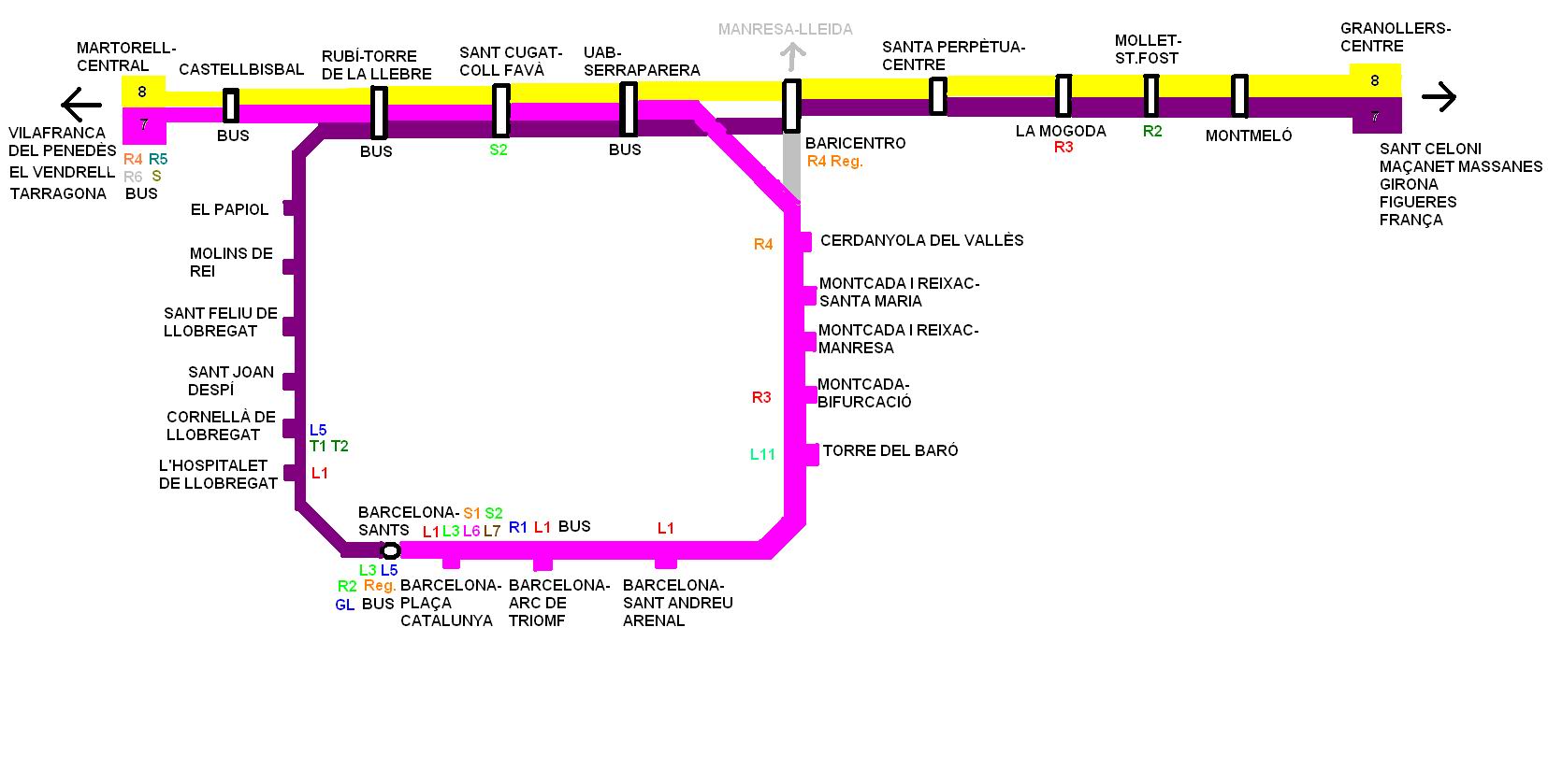 Y el sistema localizado de "MetroVallés" utilizaría en todos los casos las vías laterales para tener parada en todas las estaciones y así poder apartarse o esperar en estos andenes para permitir el paso prioritario de las cercanías que los adelantarian por las vías centrales.