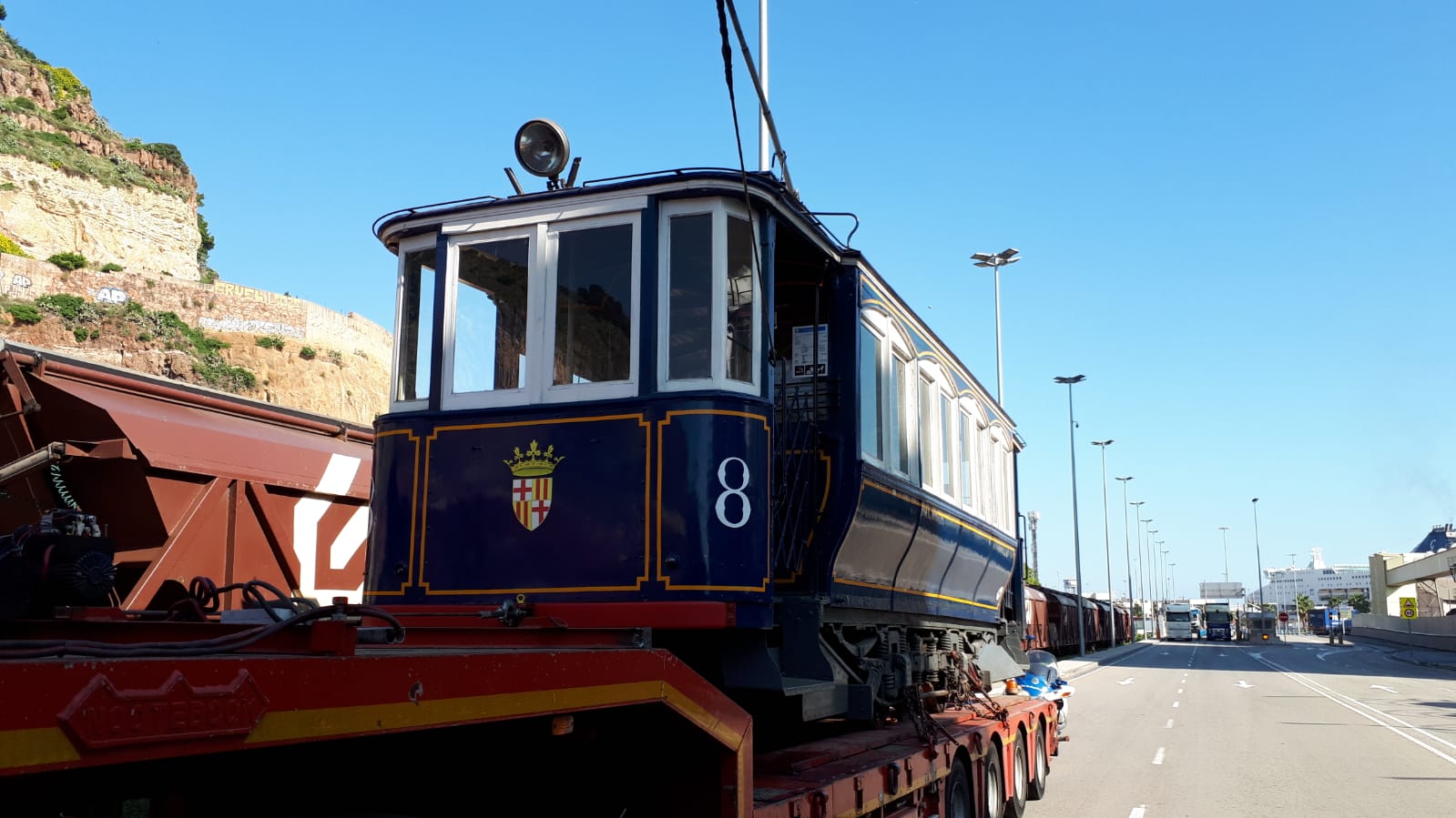 A la imatge es veu el vagó de fusta a sobre d’un gran camió baixant pel carrer Balmes. Porta aturat des del mes de gener i no tornarà a circular fins que es renovin completament la catenària i les vies que uneixen Plaça Kennedy i la del Doctor Andreu. Fonts de TMB han explicat que el projecte encara s'està parlant amb l'Ajuntament i no hi ha cap data prevista per executar-lo.