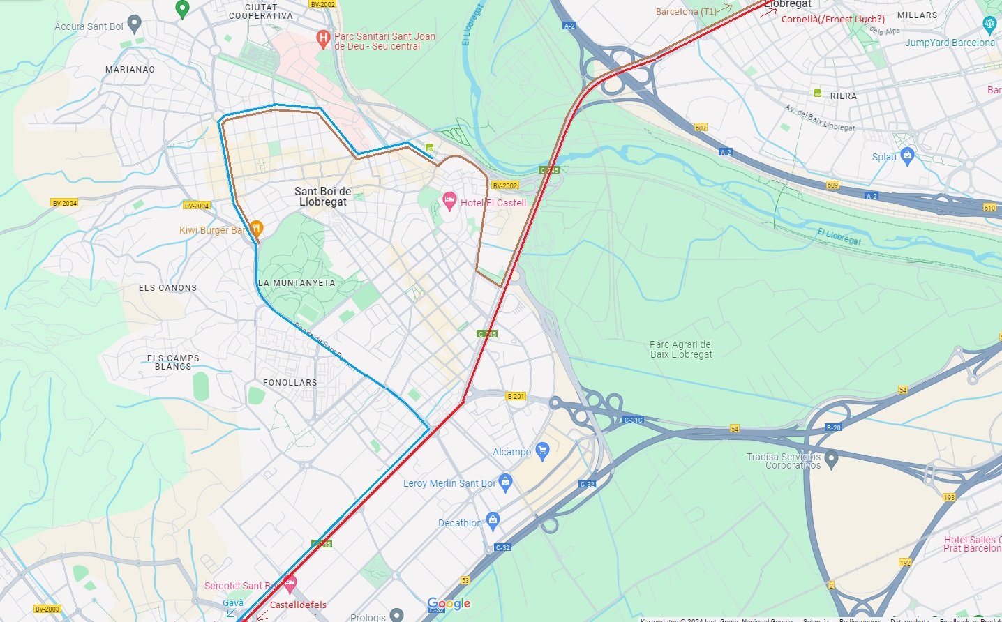 Carlos González ha escrit: 07 jul. 2024, 16:31 He volgut provar com quedaria una hipotètica L12 ampliada fins a la Platja de Castelldefels, concretament per el recorregut de Sant Boi - Esplugues volia fer el recorregut corresponent que us enllaço en el mapa.