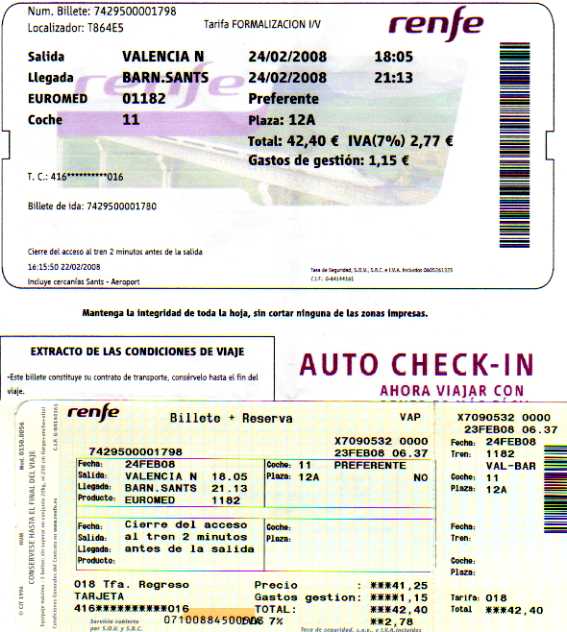 Dos bitllets que són el mateix. Primer, imprès a casa. Després al check-in de Renfe. Vaig emprar el foli i guardar l'altre a la cartera.