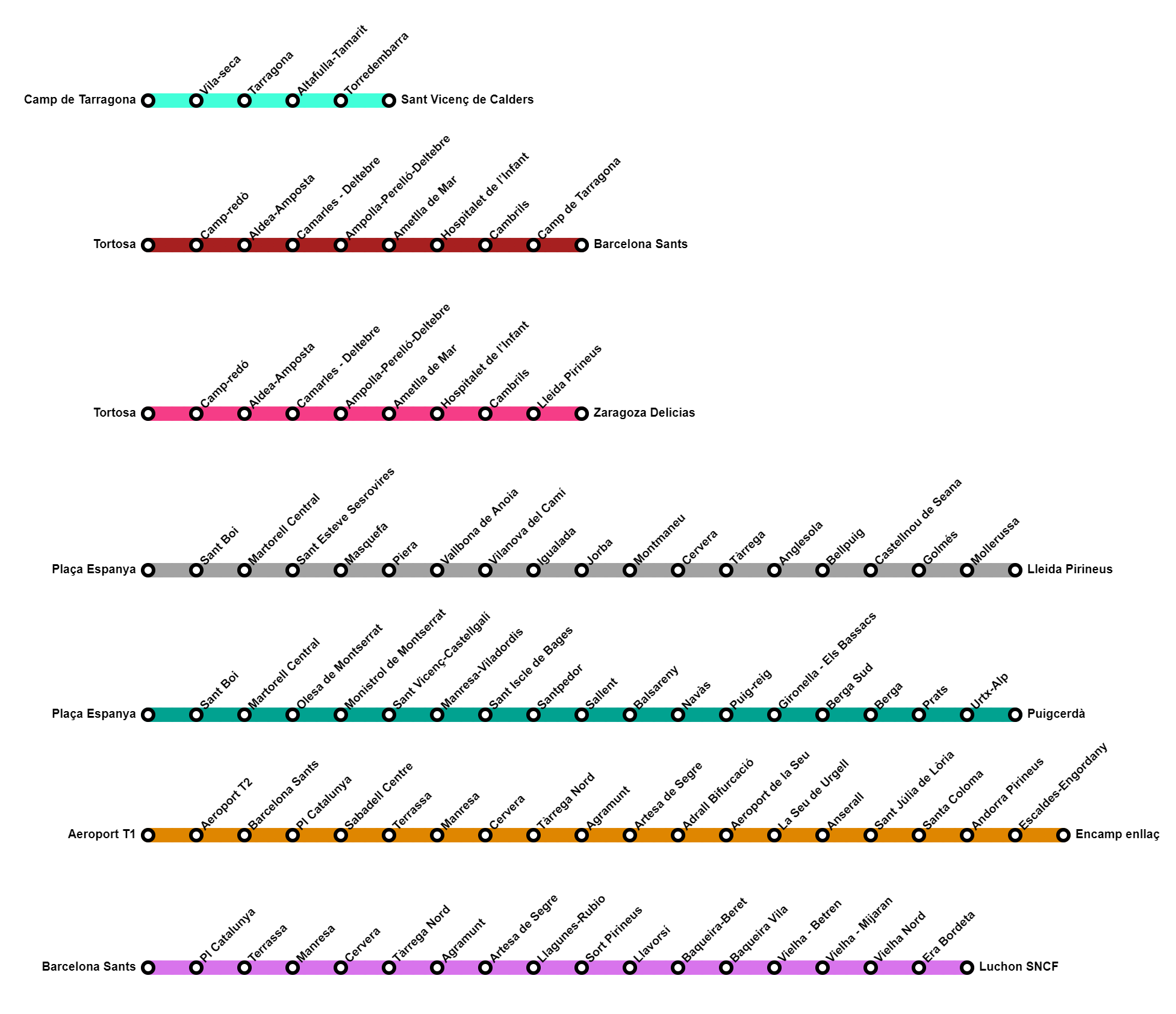 Altres línies: Eliminació dels serveis parcials i que les línies facin tot el recorregut. Les línies R1 i R2, anirien de l'Hospitalet a Maçanet Massanes. La primera, per la costa i la segona per l'interior. La R3 i R4, continuarien igual. La línia R7 ampliar-la fins a l'Aeroport de Barcelona i la R8 des de Martorell a L'Arboç o Vilafranca o Tarragona. Creació de dues noves línies R9 Tarragona - Estació de França, R10 Lleida - Tarragona - Estació de França (per Reus) També, es podrien incloure serveis suburbans com S11: Molins de Rei – Terrassa o S12: Castelldefels – Granollers Canovelles o S13: Sant Vicenç de Calders - Barcelona Sants (per costa).