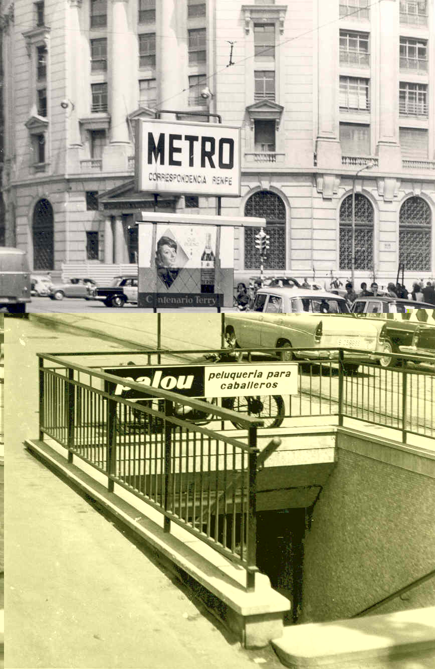 Una altra fotogràfia pel record. Una panoràmica perfecte del que no hauria d'haver desaparegut. Entrada del Metro Jaume I, amb les típiques columnes Gran Metro, i un bell edifici estil "Beaux Arts", malauradament substituit per un impersonal edifici d'oficines. Salut