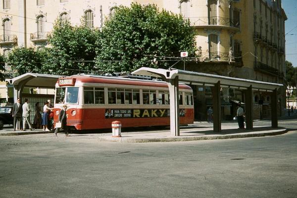 ¿Zurich moderna? ¡Pero que demagogia! Mirate algunas fotos de los años 50 de Barcelona, y verás que la disposición de las calles era exactamente la misma que en Zurich: Tranvías por el centro, dársenas de abordaje y calles de dos sentidos. Te adjunto una foto de la Pl. Kennedy en el año 56 para que te hagas una idea, por ahí hoy en día circula un maravilloso bus que no tiene la capacidad que tenía un 1200 con remolque. Es patético que incapaz de aceptar que hemos errado con el desarrollo urbanístico ahora te inventes cuentos chinos de que una disposición como era la norma hace más de medio siglo es de alguna forma "moderno", o como si no nos hubieramos cargado los tranvías y trolebuses por considerarlos "anticuados", y ver como lo más moderno el autobus. ¿Ahora de repente va a ser que es algo moderno llenar la ciudad de tranvías con derecho de vía?