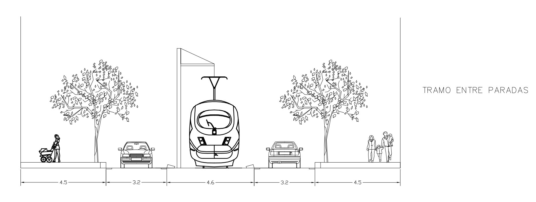 Com podeu veure, el tramvia de doble sentit fa l'amplada de tres carrils de circulació. Té molta capacitat per portar gent, però no hi cap a tot arreu.