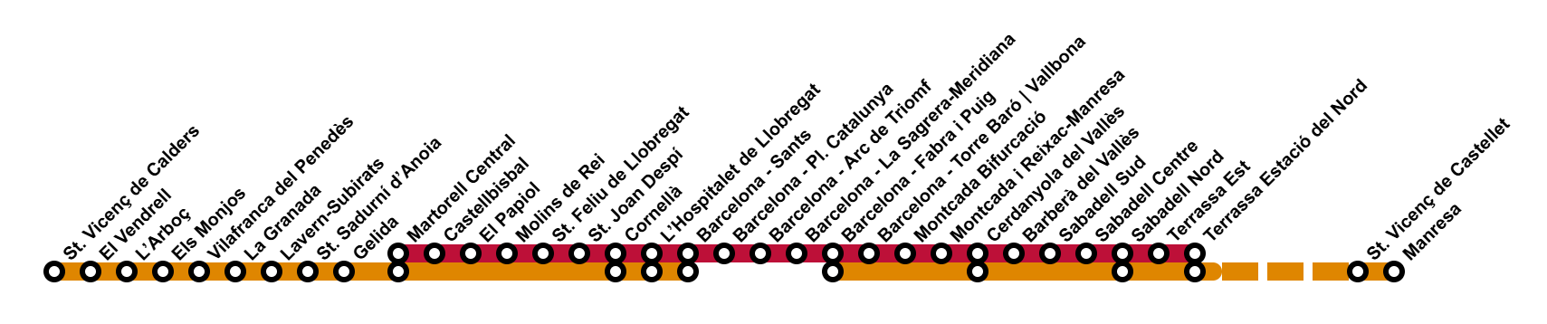 Trens ràpids entre Terrassa/Sabadell i Barcelona per la nova línia directa i la línia cap a Sants, al Vallès no fan parada més que a les principals estacions.