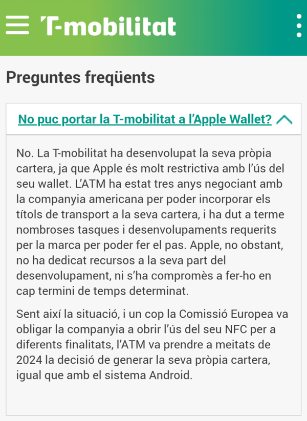 Per què no es pot fer servir Apple Wallet per recarregar la T-Monbilitat? Resposta curta: perquè a Apple no li dóna la gana: