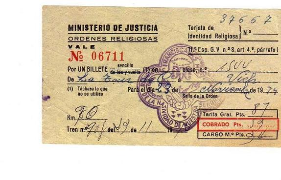 "Religiosas Franciscanas Misioneras de la Natividad de Nuestra Señora", caixetí per demanar bitllet amb descompte La Tor de Querol a Vic.