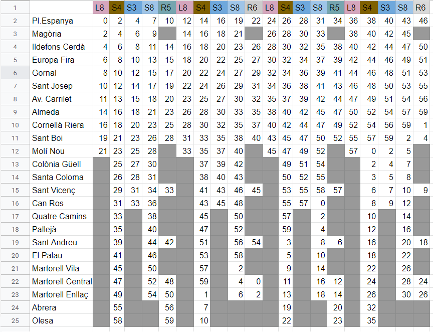 - Entre Plaça Espanya i Molí Nou: 2-3 minuts. Mitjana de 2,4 minuts. Excepte a les estacions de Magòria, Gornal, Almeda i Cornellà, on seria de: 2-5 minuts. Mitjana de 2,5 minuts