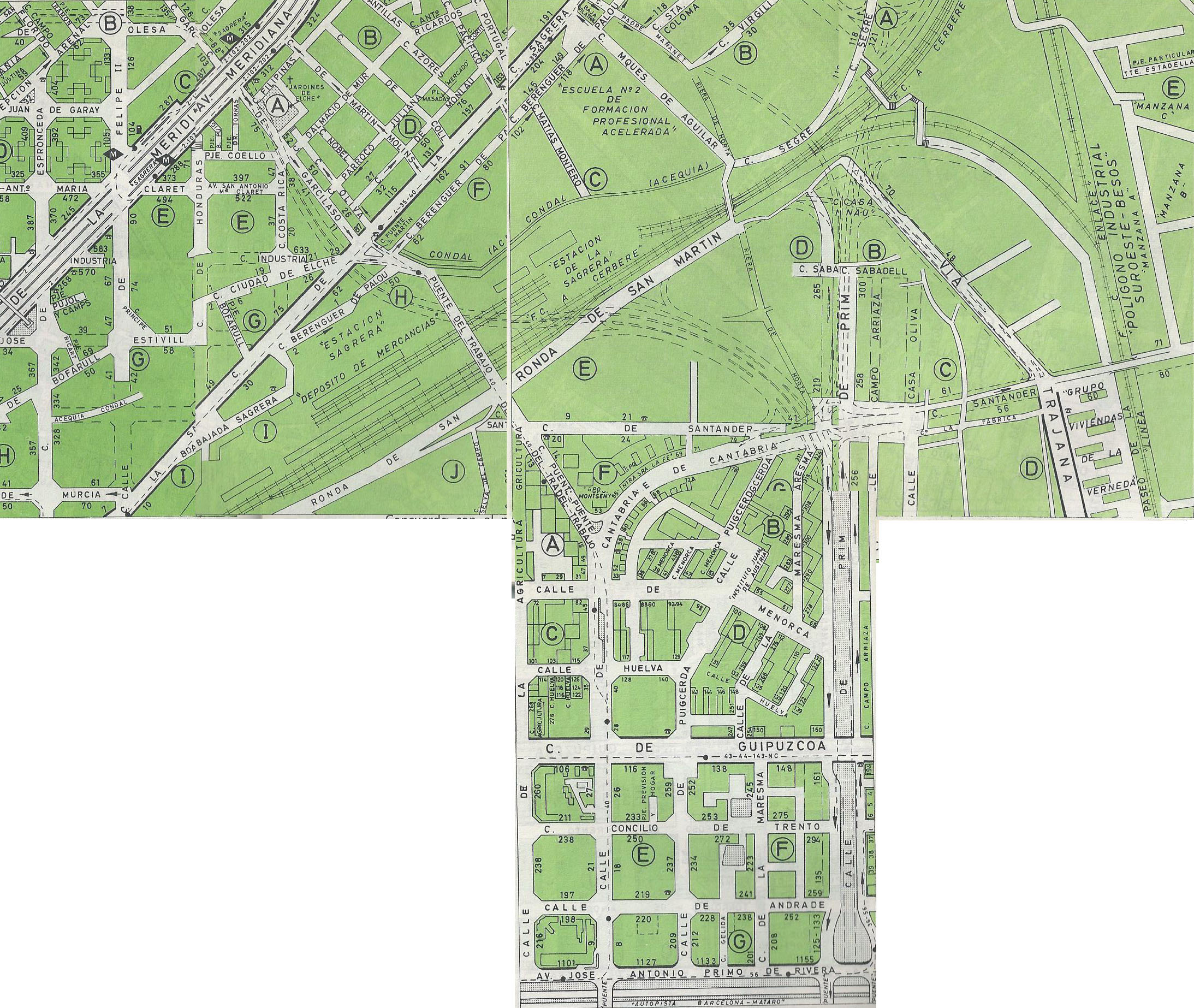 - Cap avall, el plànol representa l'autopista de Prim una mica menys definida, encara que es dóna a entendre que, com a mínim, arriba fins a la Gran Via (en aquells moments Av. José Antonio...)