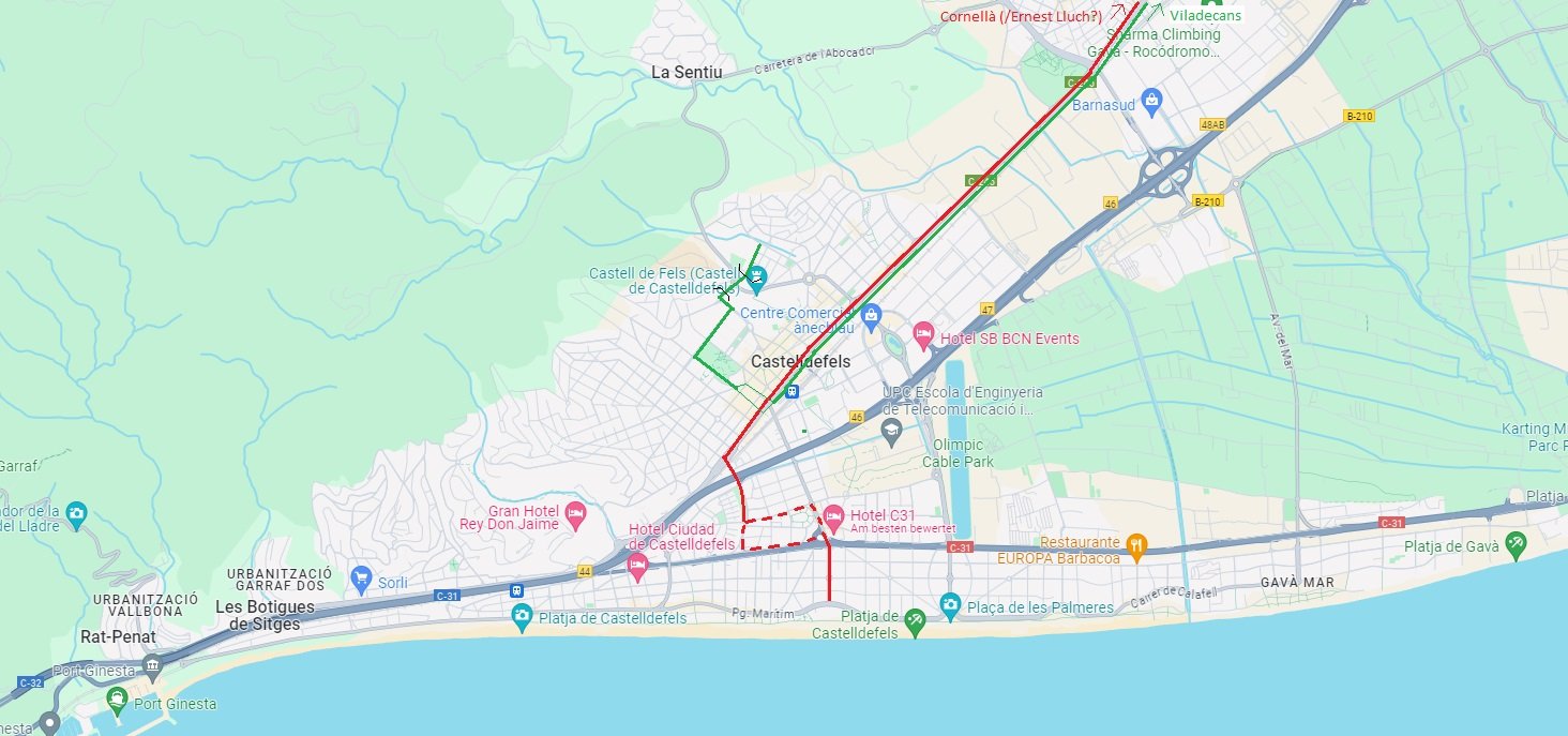 Rojo: Castelldefels playa - Cornellà o Ernest Lluch