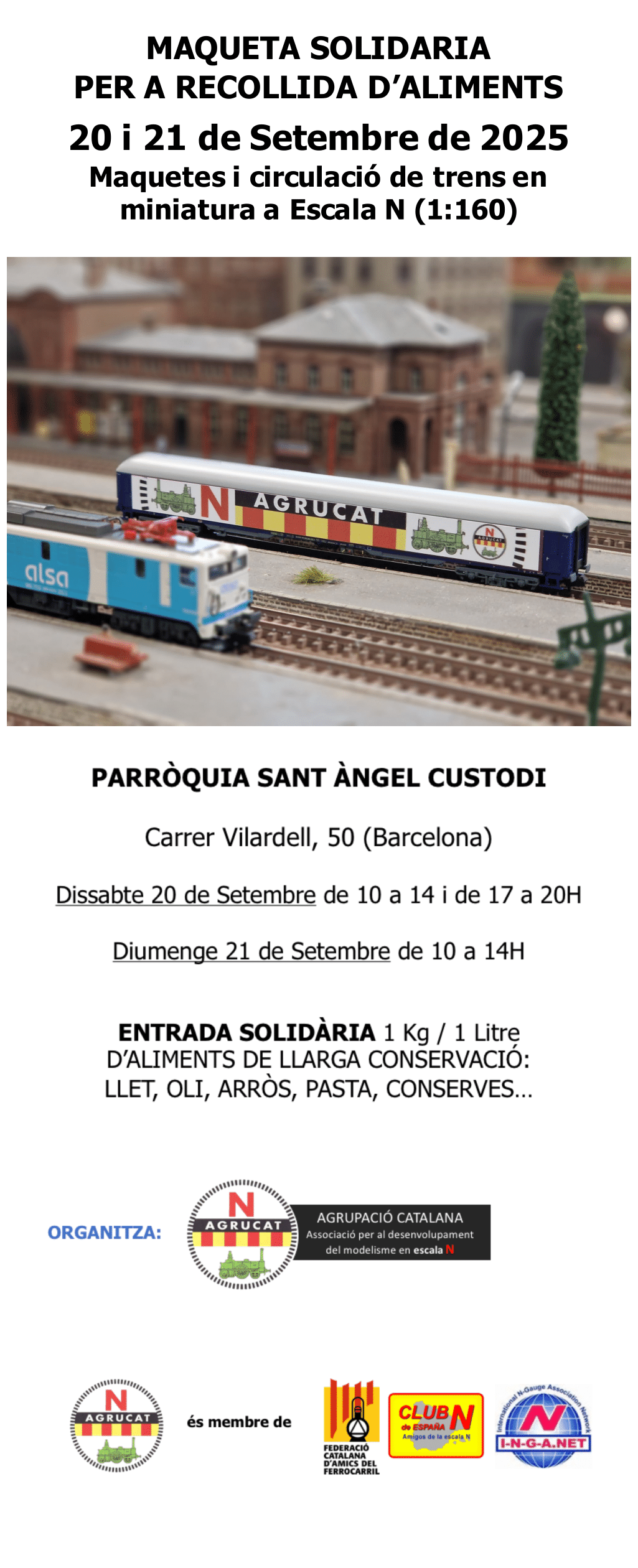 Els propers dies 20 i 21 de setembre de 2025 es durà a terme un recapte solidari d’aliments a l’espai comunitari de la parròquia Sant Àngel Custodi, al carrer Vilardell, 50, del barri d’Hostafrancs de Barcelona. En aquest acte hi col·labora Agrucat amb una maqueta solidària a escala N.