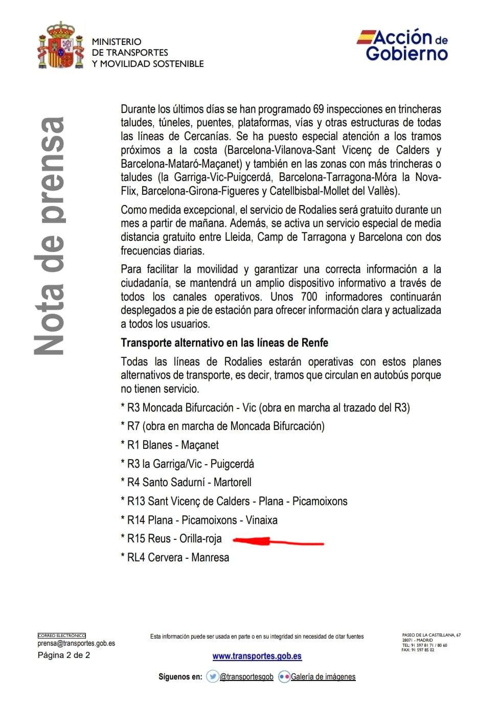 El Ministeri ha publicat al seu Twitter i a la web el llistat de línies sense servei. Inclòs el tram de la R15 entre Reus i Orilla-roja: