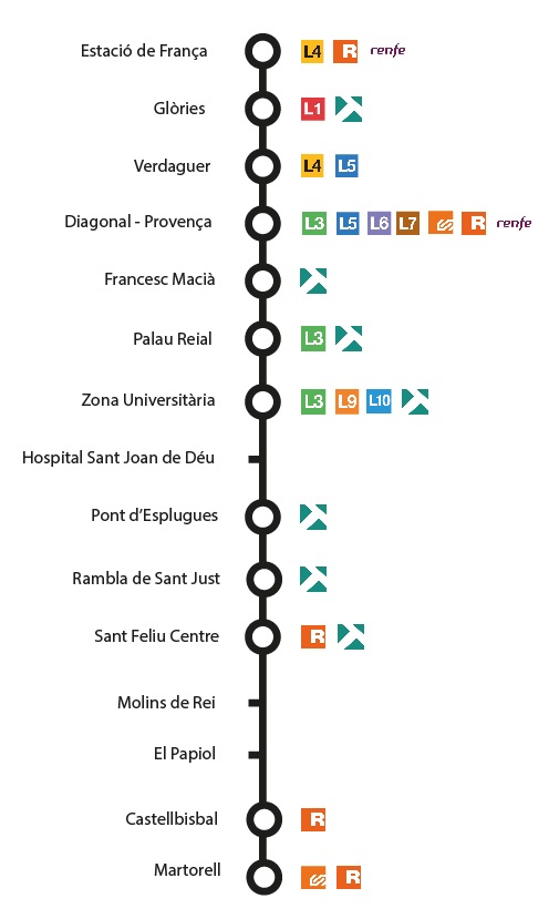 A Diagonal, s'intercanvia amb moltes línies suburbanes (S1,S2,S5,S55) i metro (L3,L5,L6,L7).
