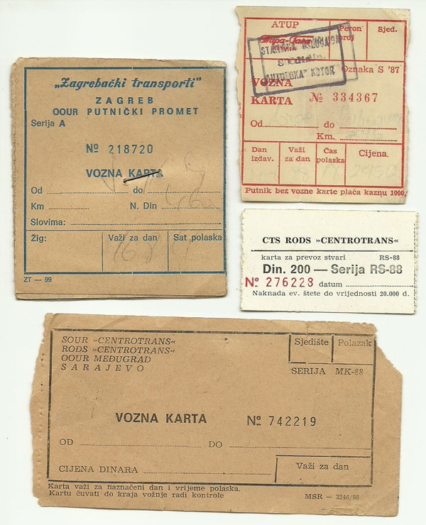 Bitllets d'autobus de l'antiga Iugoslàvia, any 1988, corresponents a algunes de les línies que circulaven per la costa adriàtica, concretament les que unien les ciutats de Bar - Kotor - Dubrovnik - Kardeljevo (Ploče) - Makarska - Split.