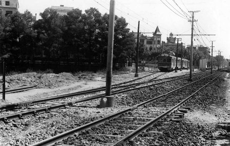 L'estació de Les Tres Torres, denominada anteriorment Enllaç (pel tramvia d'Angli), any de la foto entre 1948-1952, composició 401-801-508(posteriorment 504). Circulant per via desviada degut a les obres de soterrament a la Via Augusta i que van obligar a la construcció d'una tercera via. Fotograf desconegut. Col·lecció particular. Salut!