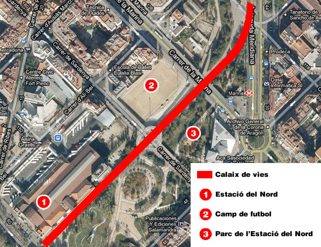 A la dreta hi han las gradas del camp de futbol que tapan el lateral del tunel, i a l'esquerra es veu el Parc de l'Estació del Nord amb la paret lateral del tunel a la vista.