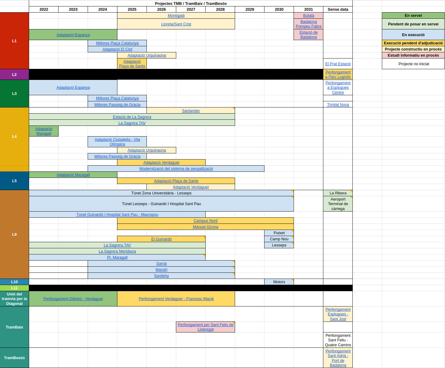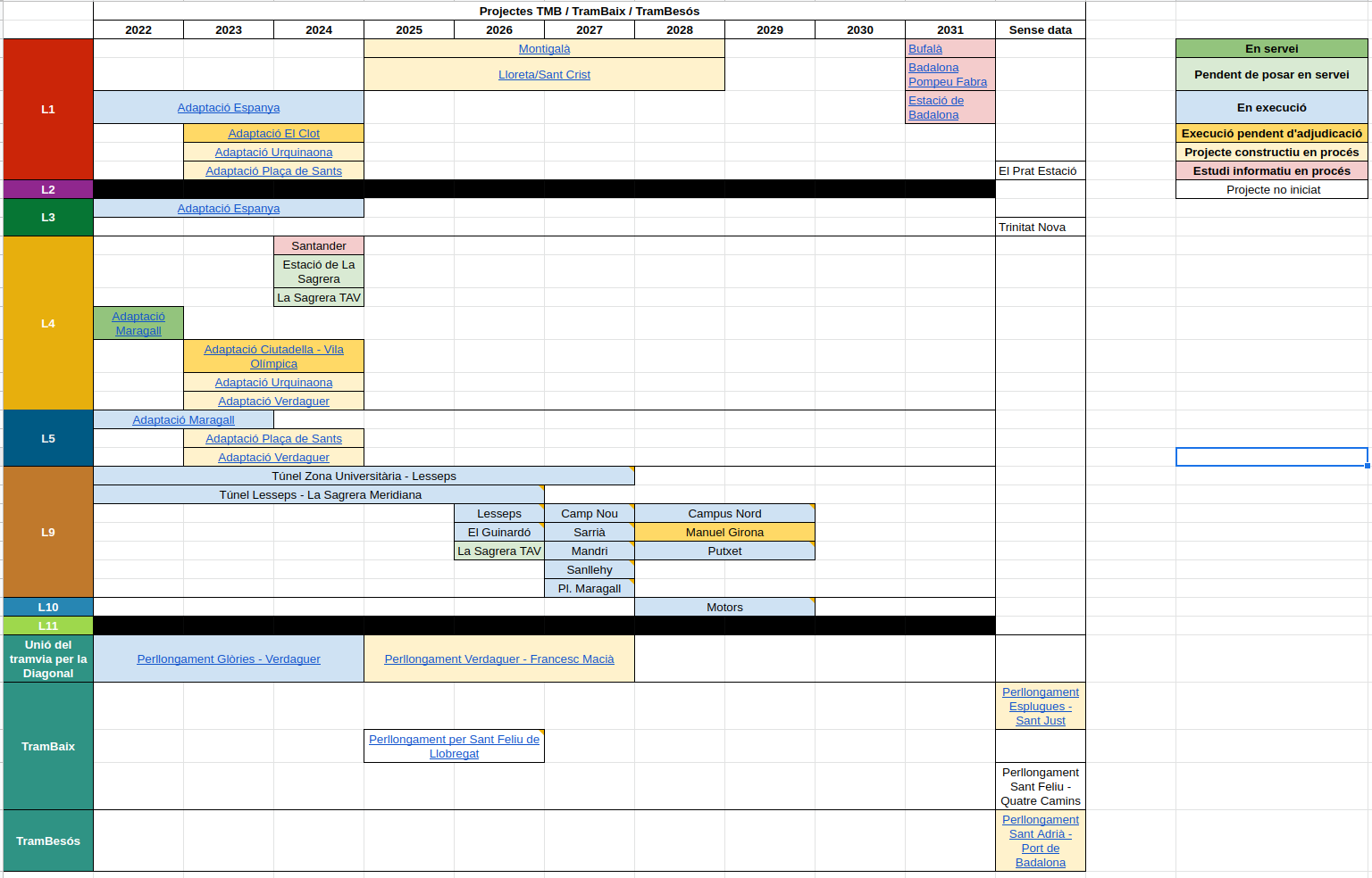 El tramvia surt al PDI, però de moment no se'n sap massa cosa. En el meu excel bàsicament hi ha anat recopilant informació de projectes mínimament tangibles, que surten al Pla de Rodalies o al PDI i dels quals s'han fet passos per tirar-los endavant. Tot i que també n'hi he posat algun que no tenia ni data. Miraré d'anar-lo completant amb els comentaris que s'han fet al fil i publicar-ne una nova versió.