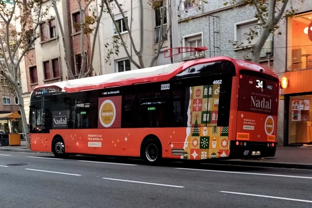 Vist el cotxe nº 4662 BYD eBus K9UD de TMB, en servei a la linia 34, amb vinils publicitaris integrals nadalencs. Fotografia propia a la parada Fabra i Puig - Arnau d'Oms (1591), el divendres 27/12.