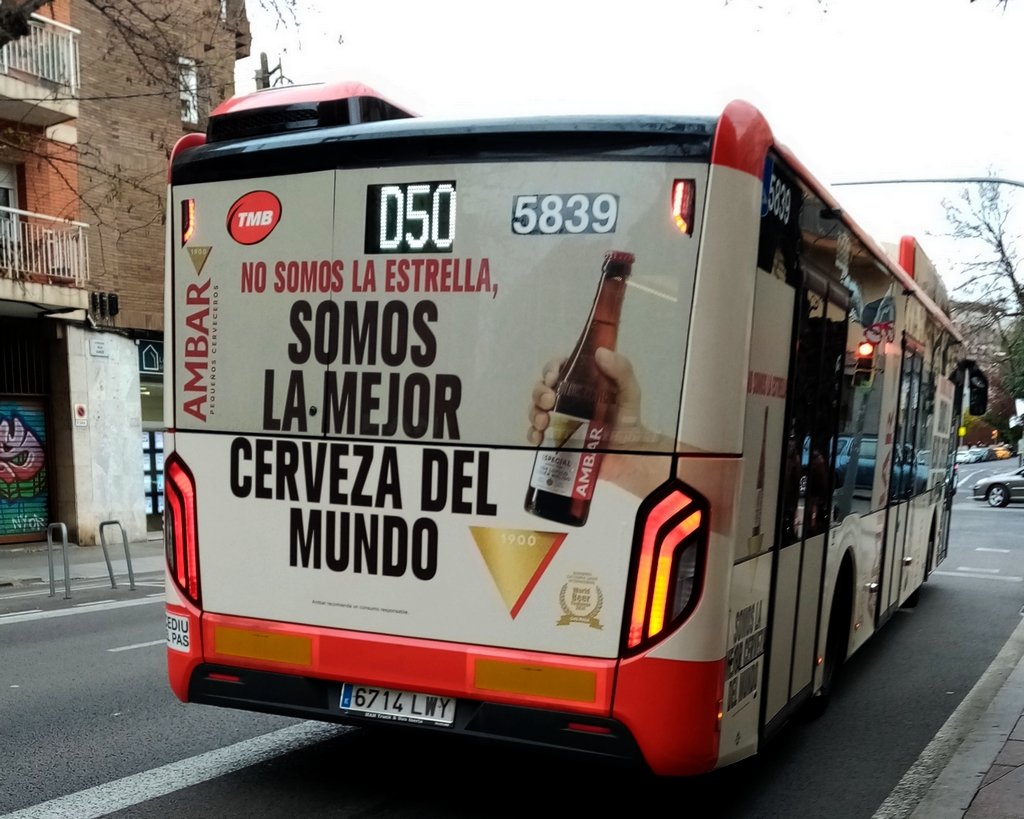 Estrena vinils publicitaris integrals d´una marca de cervesa, el cotxe MAN Lion's City Efficient Hybrid nº 5839 de TMB. En aquesta fotografia propia del dijous 13/3, el podem veure a la parada Av. dels Quinze - Costa i Cuxart (1958), fent la linia D50, en direcció Paral-lel.