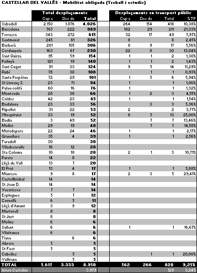 El corresponsal del foro a Castellar ja ho ha apuntat força bé, la majoria de desplaçaments són a Sabadell (45%)... a molta més distància la resta del Vallès Occidental (28%), el Barcelonès (13%), el Vallès Oriental (2%) i el Baix Llobregat (1%).